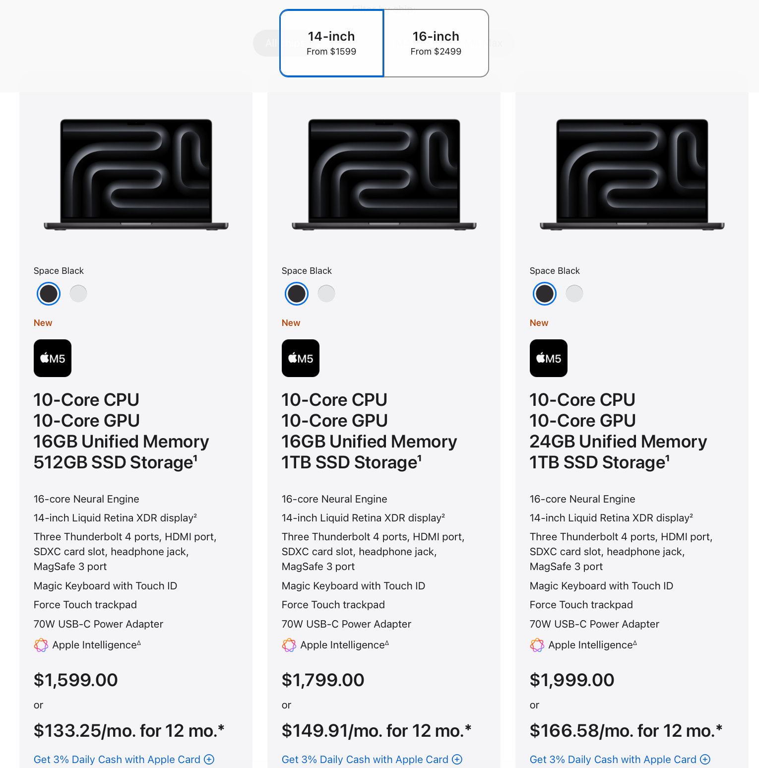 標準構成(10コア CPU / 10コア GPU、16GB 統一メモリ、512GB SSD)での開始価格は 1,599 ドル(米国)と据え置き。