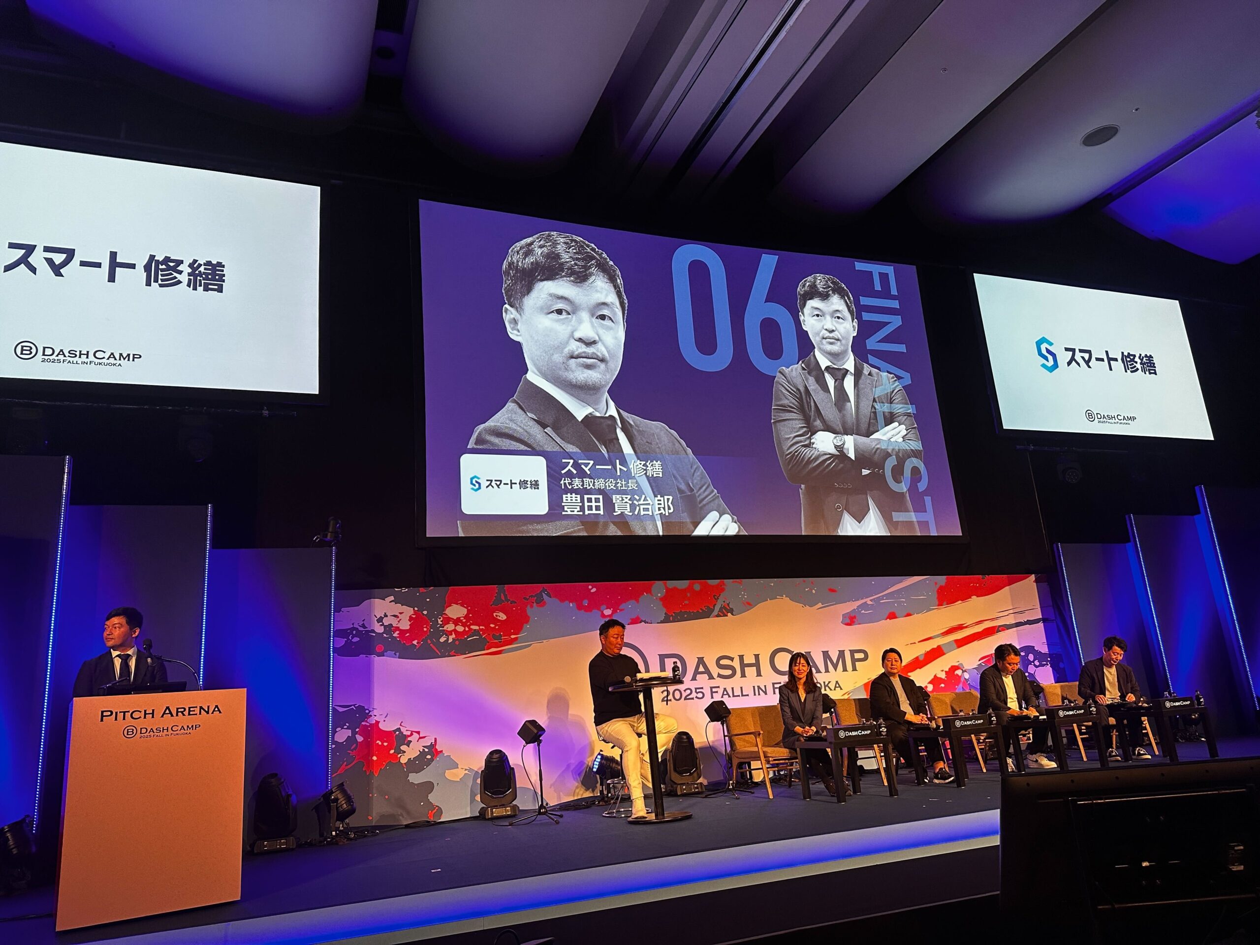 6番目の登壇者は、スマート修繕代表取締役社長の豊田氏で、建物修繕サービスを紹介しました。豊田氏は、建物修繕の市場規模が11兆円あり、老朽化した建物の増加と人件費の高騰により市場が拡大していると説明しました。同社は、管理会社からの見積もりよりも1部屋あたり20-40万円安くなるサービスを提供し、ビッグデータやAIではなく「泥臭い総合力」で問題を解決していると強調しました。メディア露出による信頼性の構築、プロセス化されたコンサルティング、経験豊かな専門家チーム(シニアコンサルタントの平均年齢50歳、一級建築士3名、二級建築士9名)を持つことが強みだと述べました。また、発注者支援を無料にするビジネスモデルを採用し、最新のクォーターで新規見積もり100億円を達成していると報告しました。