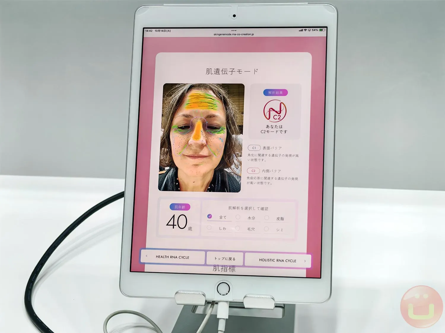 今回の展示では、実験室で行われてきた皮脂RNA解析を、スマホのセルフィーだけで推定できるAIモデルが披露された。皮脂RNAと顔写真の大規模データを組み合わせて学習したことで、撮影した自撮り写真からC1/C2の判定や肌年齢、質感、くすみ、シミ、トーンなどを可視化。さらに「Smooth Phase」「Glowing Phase」という2つの肌モードを提示し、その日に最適なスキンケアアクションを提案する。