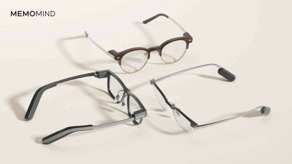 ラインアップの中核となるのが最上位モデル「MemoMind One」だ。詳細なスペックは未公開ながら、両眼ディスプレイとスピーカーを搭載し、プロモーション画像からはシンプルな単色グリーン表示や、Harman Kardon製スピーカーの内蔵が示唆されている。操作はテンプル前方に配置されたタッチポイントやボタンで行う設計とみられ、複雑なジェスチャー操作を必要としない点も特徴だ。