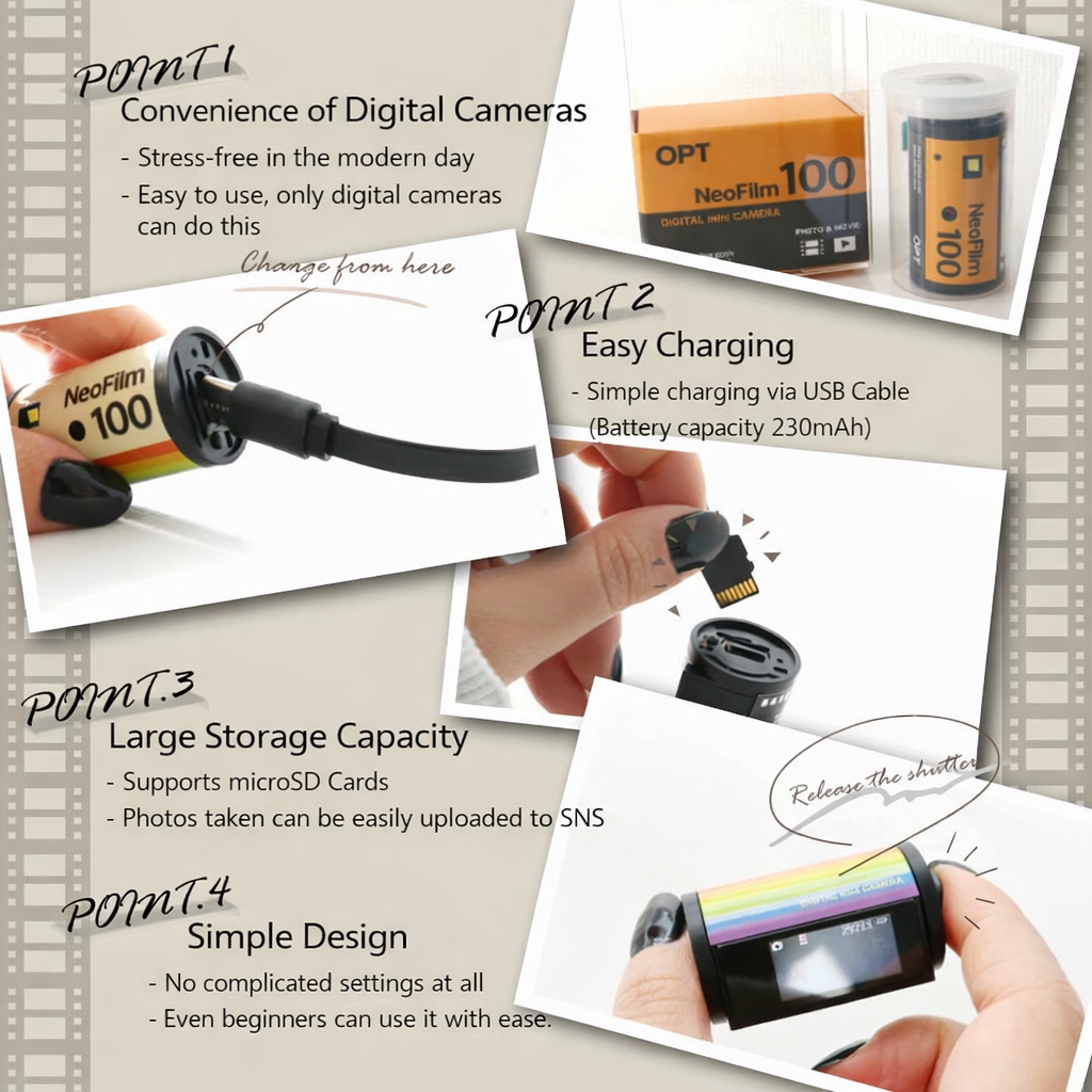 価格は5,940円。現時点では日本国内のオンラインストアなどで販売されている。アナログ写真文化へのオマージュと、超小型デジタル機器という現代的アプローチを融合させたNeoFilm 100は、“持ち歩けるレトロ”という新たな体験を提案するプロダクトといえそうだ。